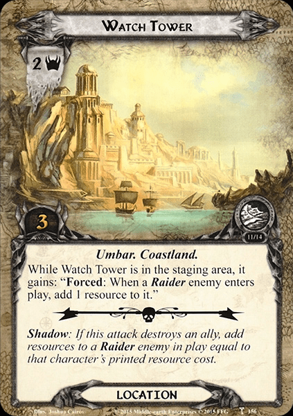 We had 10 different cards nominated for favorite encounter card for The City of Corsairs. Only a single card, Watch Tower, got more than one vote (it only got two votes). This is a fairly soft location in low player counts (to which our data heavily skews). If this is the only card you reveal, the chances of it actually doing anything before you travel to it are pretty slim. In higher player counts, though, this will cause more problems.