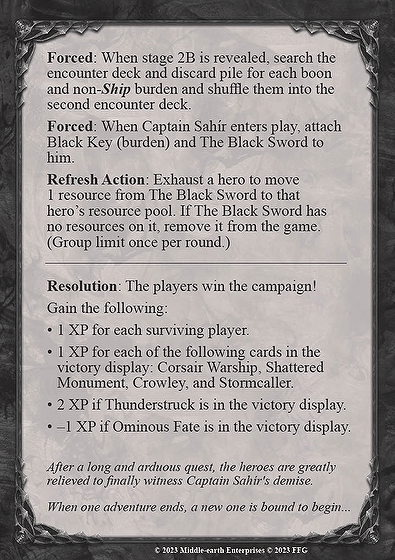 I went all-in on sailing/questing and was able to complete stage 1 on round 2 (albeit w/out destroying Stormcaller). From there I slowly built up my forces, completing side quests (Gather Information, Double Back, Keep Watch) and sending Gavin repeatedly to Send for Help, until I was more than ready to take down Sahir. A few fun moments included: using Bilbo Baggins (T) to slowly wound a Raid Leader to death despite his 9 defense, Send for Help (T) summoning Eowyn (T) to go beast mode on two corsairs, killing two Corsair Infiltrators with a single Skyward Volley, and realizing at the very end of the game that I had forgotten to attach Parrying Cutlass to Thranduil during setup and so was operating at a 2/3 defense deficiency the whole time(!). This has been a fun and rewarding campaign, and it is bittersweet to see it end.