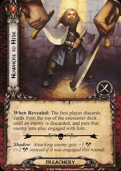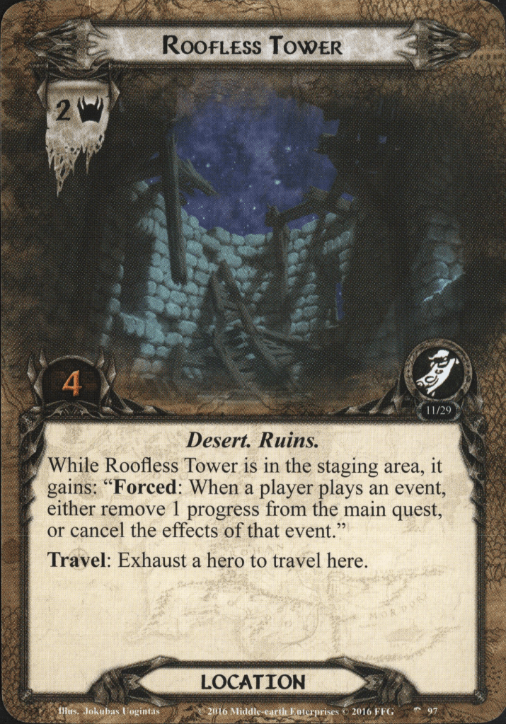 There were two cards nominated in both categories: Nowhere to Hide and Roofless Tower. Both cards have pretty interesting designs, especially as they relate to this quest. With Nowhere to Hide, you are not adding any threat to the staging area and if you’re set up to deal with enemies it’s not really a big deal. The only problem is that all the Haradrim enemies have effects that trigger when they engage you that might make you face a tough choice. Roofless Tower also introduces another strain on progress on the main quest: events now cost progress. This is a very interesting design that works very well with the core mechanic of Haradrim removing progress.