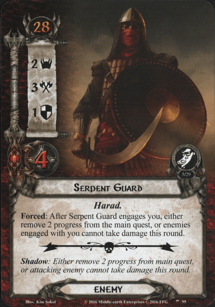 The card that was voted the overall least favorite encounter card of this quest was The Serpent Guard if you are not managing your threat carefully and/or putting enough progress on the quest ever round, you may find yourself in a situation where you keep getting enemies engaged with you and no way to deal damage back to them.