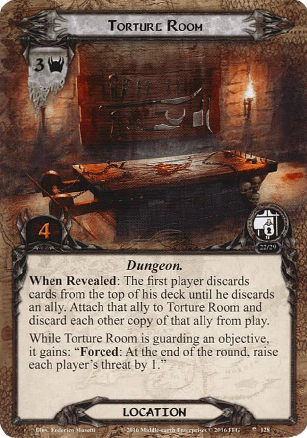 The only encounter card to get more than one vote for least favorite encounter card was Torture Chamber. Again, this quest hits your threat pretty hard, so this Forced effect can be pretty brutal (especially if you have more than one of them in staging). Not only that, but the When Revealed effect has the potential to cause a lot of board damage (especially if the ally discarded is a non-unique ally that all players have copies of in play).