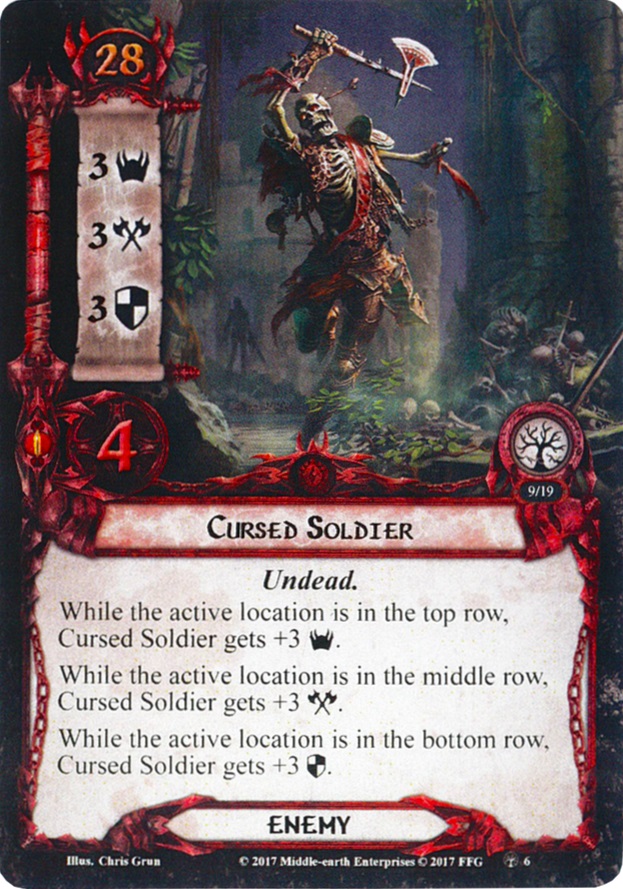 - Cursed Soldier: It’s tricky when the enemies keep switching up their stats, and the Cursed Soldier in an expert in this. Depending on the row of your active location this round, he will gain +3 to his threat, attack, or defence. With an engagement cost of 28, you will have to deal with him soon. In an ideal world, you would reveal him while you are in the middle row, and then travel upwards to reduce his attack once he is engaged with you. But that’s the sneaky trick to this enemy; it wants you to swap rows, and not progress further to the right. It’s a dilemma between finishing off a rather nasty enemy or progressing the game, and you will find that the decision on where to travel is going to be trickier the more of these Soldiers are in play. Note that you can also use the Deceitful Island treachery to your favor in case you are revealing this enemy while you are at the top row. Moving down will save you some threat. The four hitpoints on this enemy will mean that you might have to break out some direct damage to finish him off, especially once he has 6 defence, if you are on the bottom row. Gandalf can one-shot this enemy, but you can also use Poisoned Stakes or a combination of other effects to bring him down without having to attack him directly.