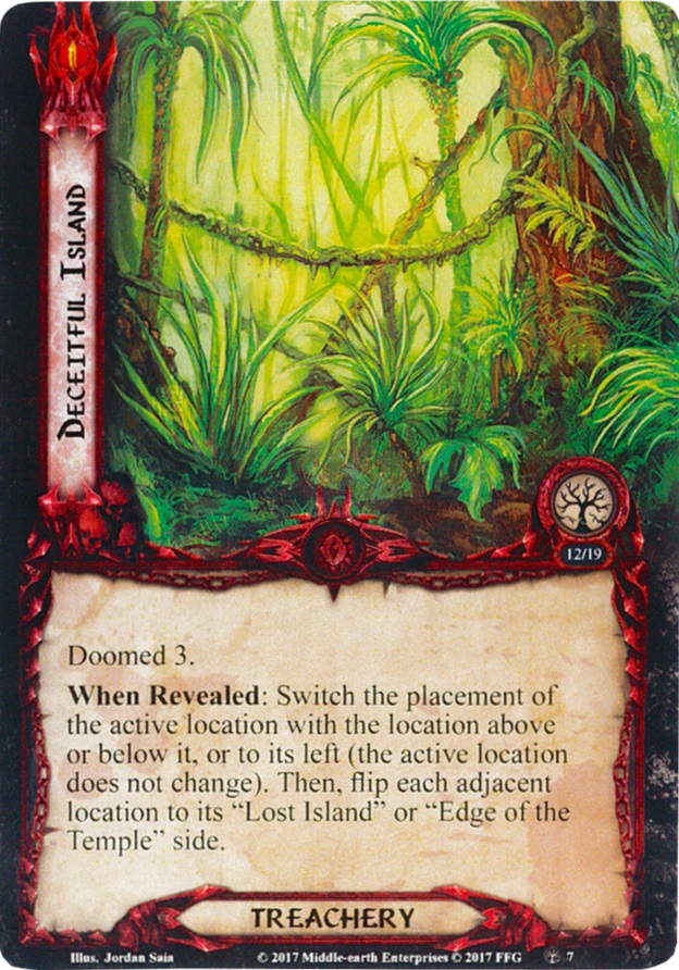 - There is a lot of Doomed in this deck, so your threat will be under pressure here. Deceitful Island is the only card that raises threat directly; the other six treacheries are more situational. Bring threat reduction to counter this.
