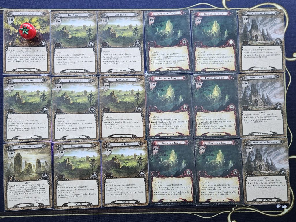 - You can end up having a pretty long game trying to find the right locations. The threat increase at the end of each round on top of the many Doomed keywords on treacheries will require you to bring some form of threat reduction. Double Back is a good card to bring, as side-quests are pretty free to use as you explore the island and don’t care about flipping Uncharted locations.