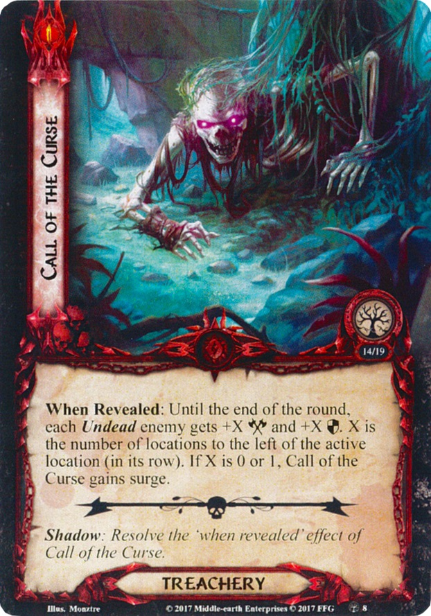 - Call of the Curse: That looks and sounds like a sweet metal album for sure. It does, however, pose a serious danger to your boardstate as this treachery will boost the stats on every Undead enemy in play until the end of the round. If you are hitting this card for a shadow card, too bad, you are going to have to resolve the When Revealed effect all the same. This will boost the attack and defence of every Undead enemy in play by X, where X is the number of locations to the left of your active location. This does not count the active location itself, so if you just started the game, X is zero, and you can just have combat as normal. If X is zero or one, you do have to resolve Surge on this card. In the late game, this is going to hurt a lot, as you will have up to five locations to the left of your active location. This will make any fight a struggle for survival, and makes this a treachery worth cancelling. You can also try to cancel attacks instead, though the increased defence will mean you are unlikely to kill any of the enemies engaged with you. This also won’t work on the Temple Guardian, who is immune to player card effects and will hit you for even more damage thanks to this treachery. At that point, chumping is the only real option you have left. It’s a deadly treachery that is worth putting in the Victory Display during the early game so that you won’t have to deal with it later.