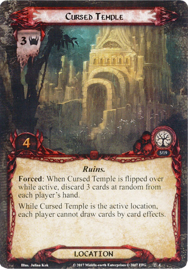- Cursed Temple: Get used to some pretty brutal locations for the rest of this segment, because these are not going to be fun to have to trek through. The Cursed Temple cannot be avoided, though, and ideally is the only one of the three locations you have to go through before reaching the Temple of the Deceived at the other end. This location replaces the Cursed Temple from the normal set and will be the point where the Temple Guardian starts attacking the players. You will have to defeat him in order to claim the key he is guarding that opens up the final column of locations. That makes this a mandatory location to find and have active. When doing that, the Cursed Temple will trigger its Forced effect. This makes each player discard 3 cards from their hand at random. This is not the worst effect out there, and hopefully you have already played the cards you needed before venturing into this side of the map. But if you were holding on to some events, there is a risk that you have to discard them here. You also don’t get to pick, so if you have more than 3 cards in your hand when moving here, you can roll a die or have another player pick the three cards for you. After the Forced effect has resolved, there is still a passive effect that will linger while the players have Cursed Temple as the active locations. They are not allowed to draw cards through player card effects to replenish their hand. You do still draw a card for the round though, so you are not totally out of options just yet. Noldor decks and those playing hero Gandalf will be at an advantage, since they can play cards from the top of their deck or from their discard pile, having some options available. The location only takes 4 progress to clear, so if you make 12 progress total, you are able to look at one adjacent location in order to see if you want to go there next.
