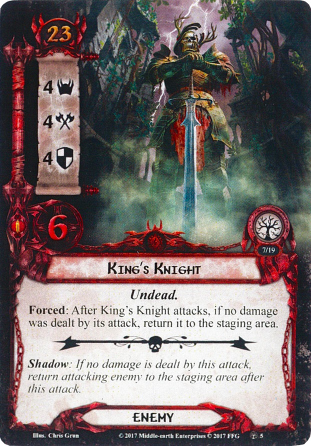 - King’s Knight: Now that’s a killer pose! And I’m not just saying that because this enemy killed 5 of my allies. The King’s Knight has some big stats to start with, and considering that Call of the Curse can increase that attack and defence further, you are going to be in for a tough fight against this enemy. The high attack stat can also be useful in combination with his ability. That requires the King’s Knight to do some damage with his attack, or else he returns to the staging area. With an engagement cost of 23, you can count on it that he will bounce between players and the staging area if you don’t lock him down somewhere. Traps are a good idea here, with Ranger Spikes keeping him in the staging area, and Ithilien Pit opening up the ability to attack him wherever he runs off to. Abilities to kill in the staging area are also going to be useful, though a base defence of 4 with 6 hitpoints (not to mention any boosts) is going to be tough to get through. If you can find a way to adjust your defence after revealing a shadow card from his attack, you can find a way to only have the King’s Knight deal a point or two in damage. Blood of Numenor, Livery of the Tower, or Protector of Lorien give this sort of flexibility (as long as you have resources/cards to spend). This allows you to keep the Knight engaged with you, giving you the best chance to clear this tough enemy.