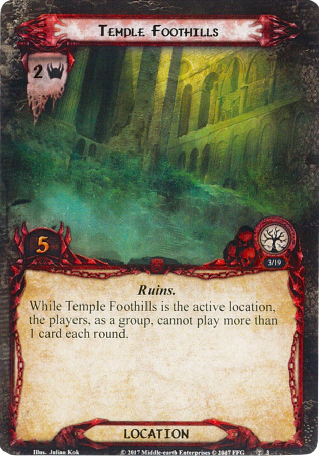 - Temple Foothills: You will be wanting to move away from this location as soon as you possibly can, as it is very dangerous to your group to stay for very long. There is no Forced effect when you travel here, but the passive effect will restrict players to only playing a single card per turn as a group. Not 1 ally, not 1 card per player, no. Players as a group may only play a single card that turn. This means that you have to discuss on whether you need to cancel a card that came from the encounter deck, or save it in order to play an ally in the combat phase to handle a big attack. Note that players may still put cards into play via effects like Vilya or A Very Good Tale (though that event would count as your one card per round). This passive puts you at a major disadvantage against the encounter deck, so you will want to make the 5 progress on the location as soon as possible. There is also no blanking this passive effect through cards like Thror’s Key, unfortunately, since the location was not added to the staging area. So you are out of luck and have to quickly move on to a different location to minimize the damage this delay in playing cards will do to you. This location also makes the other two options worse, as you are likely saving up cards and resources during your rounds here, which will be discarded as soon as you move to another Edge of the Temple location. Try to use resources and cards for hero abilities instead, before you have to discard them for nothing.