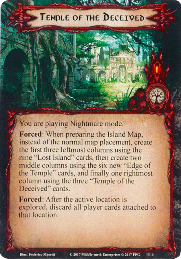 - Edge of the Temple: The three new Nightmare locations should be placed in columns 4 and 5 of the map with this side face-up, while the players do not peek at the backside of the location. This side is a buffed version of the Lost Island location you have traversed before, made only a little more difficult by the fact that it has 3 threat instead of 2. This means that the total threat in the staging area can suddenly increase once you venture into the right half of the map. Like Lost Island, this side of the location cannot have attachments, and when it becomes the active location, players must flip it over. The players are allowed to look at the back of the location, but in exchange for 8 progress on Edge of the Temple. This is double of Lost Island, and not easy to get in one try. Players might need additional turns to make that much progress on a copy of Edge of the Temple while also clearing the threat in the staging area and their own active location. But flipping over a copy of this location does provide players with important information. There are three backsides to this location, each with a punishing Forced effect if players travel there. Being prepared for what is to come is worth a lot for this version of the quest. Ideally, you get a Cursed Temple right away so that you can claim the Gate Key and swiftly move to the Temple of the Deceived.