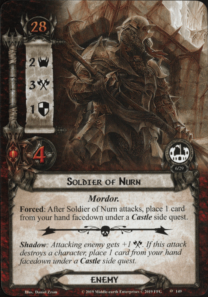 There were two cards this week nominated for both favorite and least-favorite encounter cards. Shockingly, one of those was The Dark Lord’s Reach. We’ll talk more about this one shortly. The other was Soldier of Nurn. One of the things I find fascinating about this enemy is that, although it certainly looks like an orc, it doesn’t actually have the Orc trait, meaning that there is a Man beneath that ugly armor!