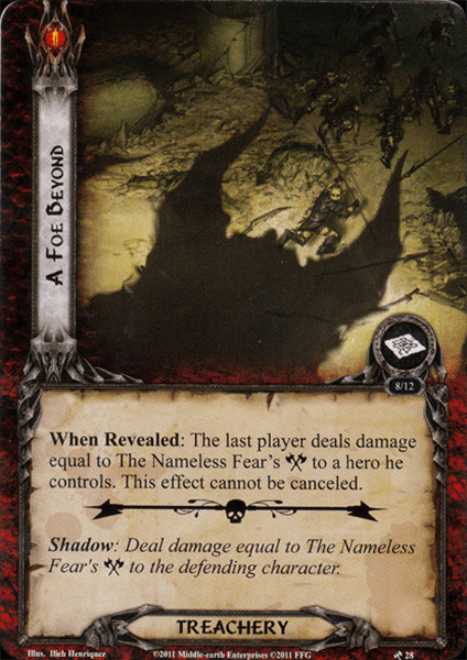 There was a two-way tie for favorite encounter card this week between A Foe Beyond and Plundered Armory. We talked about Plundered Armory last week, so let’s take a brief look at A Foe Beyond, which is the signature treachery for this quest. It’s wild to me that this is the favorite encounter card this quest, because both its When Revealed ability and its Shadow effect can pretty easily kill a hero. However, it is fun to play around this card and come up with creative ways to deal with it. There are 1 per player copies of this in the deck, so in four players you’re probably in for a pretty rough time.
