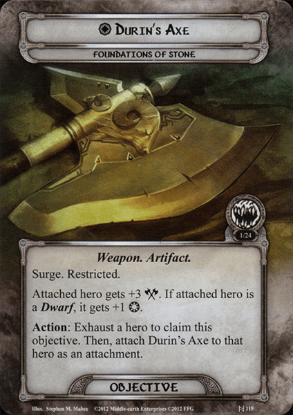 The winner of “favorite encounter card” this week is Durin’s Axe. You won’t find this card until you are washed down to the depths of the earth, so this can be a very nice way to get your board set back up. The narrative implications have always fascinated me too. We find Durin’s Axe “far below the deepest delvings of the dwarves,” and yet here is an axe of legend. Was one of the Durins (for many kings of the Dwarves took that name) taken down here by the Nameless Fear? Did he voluntarily plumb the depths to seek revenge on the darkness below? We can delve into these unexplored corners of Middle-earth, but more questions always arise.