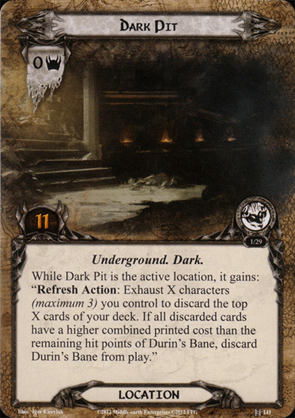 The winner of the favorite encounter card was Dark Pit. This is the key location in this quest that actually lets you win by discarding Durin’s Bane from play. It’s an interesting location that shows some early game design because if you accidentally travel here too soon and then explore it, you basically lose the scenario. It also has an interesting uncertainty mechanic where if you get Durin’s Bane down to low hit points, you have a chance to defeat the boss in the Refresh phase, which is a fairly unique mechanic in this game.