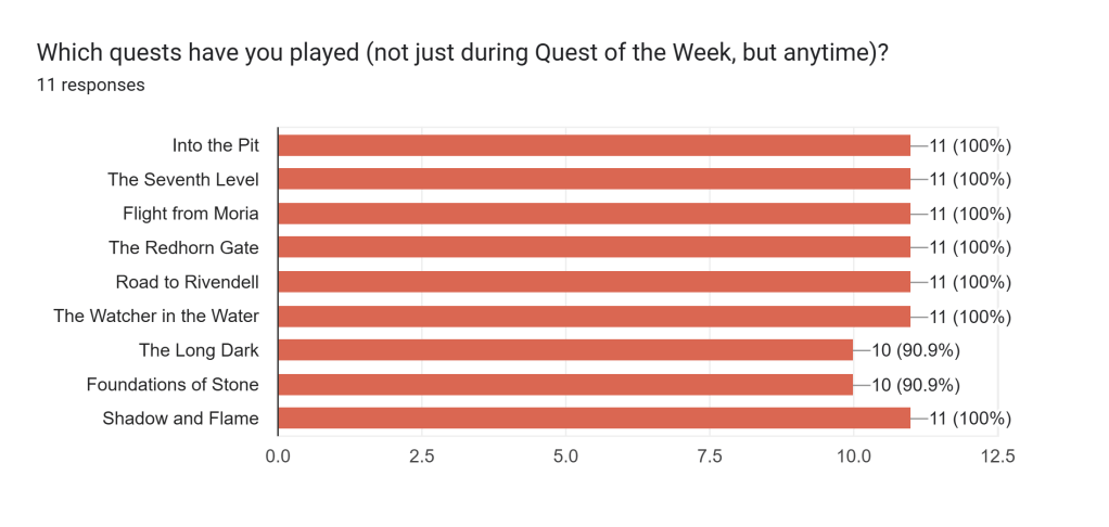 Now let’s take a look back at the cycle as a whole. We got 11 responses to the cycle questionnaire, and first I asked which quests in this cycle folks have actually played: