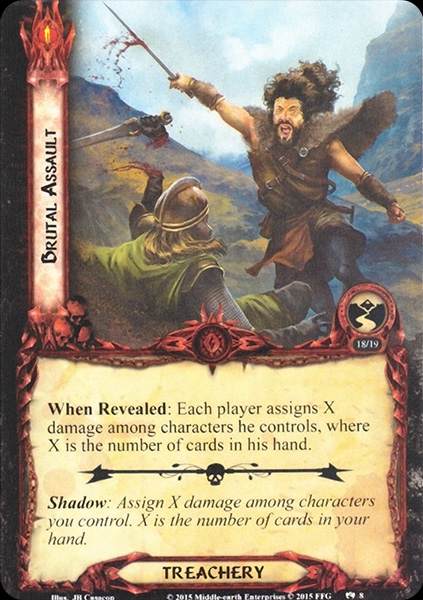 - Brutal Assault: Only two copies of this will be in the encounter deck, but it will be enough to make you fear it coming at you at the worst time. The effect is rather simple, but in combination with all the combat happening, you really can’t afford taking a lot of direct damage. Because that is what this treachery will dish out. Each player must assign X damage among characters they control, where X is the number of cards in their hand. Usually, this will deal 3-5 damage to characters, but luckily you can assign this damage to allies as well. As long as you have sufficient healing, you should be ok. The real danger comes with the timing on this card. If you just started the game and don’t have that many characters in play yet, then your heroes will take a beating before the combat phase has even begun. Remember that you can also select Grima to take some of the punishment, just don’t kill him. This card also gets some bonus points for the gruesome Nightmare artwork, with that hand being properly severed at the wrist.