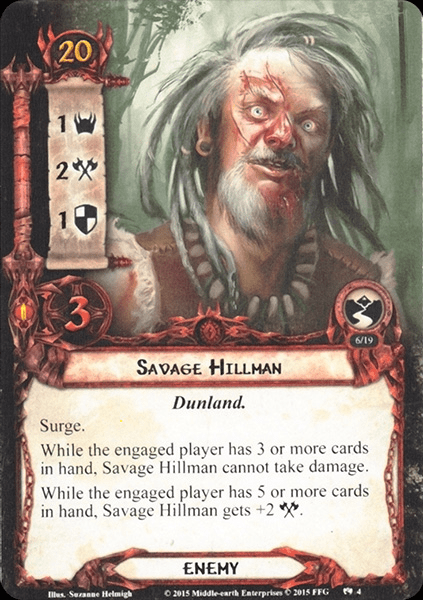 - Savage Hillman: Real case of “Crazy Eyes” with this one. You just know he is going to pummel you over and over again, and you’ll be glad to finally be rid of him when you get around to attacking him. This is made more difficult by his passive effects. If the engaged player has three or more cards in hand, the Savage Hillman cannot take damage (even from other players’ Ranged attacks or from traps/events). To make it worse, the Savage Hillman will double his attack stat to 4 when the engaged player has 5 or more cards in hand. He does only attack once per turn, but getting several of these engaged with you while you cannot reduce the number of cards in your hand is pretty brutal. Forest Snare or Entangling Nets can buy you some time to focus on other enemies first. Upon reveal, the Savage Hillman will surge, and he contributes 1 threat to the staging area. He won’t stay up there for long thanks to his 20 engagement cost. The 2 attack is manageable, but once you have 5 cards in hand and he attacks for 4, it becomes far more difficult to find a proper defender. 1 defence and 3 hitpoints is pretty mild for a Nightmare enemy, so once you have fewer than 3 cards in hand, he should die pretty easily.