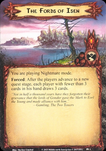 There is just a small additional rule in the Nightmare version of this quest, which will only trigger twice during the entire game. This will force each player who has fewer than 3 cards in their hand to draw back up to 3 cards whenever the players advance to the next stage of the quest. Note that this does not trigger when clearing side-quests, since that’s not counting as advancing to a new quest stage. This additional card draw does not also trigger either of the Condition attachments that might have been stuck to the previous quest card. Those have left play before this Forced effect triggers, so that helps a little.