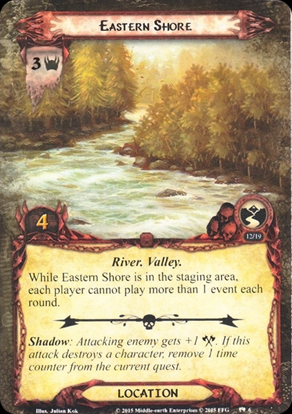 - Eastern Shore: The Eastern Shore is a much more stable card than its western counterpart. It does not change with the number of cards in your hand, but simply provides a passive effect to the game. Players are limited to playing 1 event per player each round. This is done for two reasons. The first is to limit the control that players have over the scenario. Silvan decks are hurt quite a lot by this, as they tend to play a lot more events per round than just one. But the main reason behind this passive is that players could easily drop the number of cards in their hand outside of the planning phase by playing some (free) events. This then sets them up nicely during the combat phase and can compensate for any cards they had to draw through encounter card effects. Players are still allowed to play one event per round, but that’s it. This requires some careful planning on whether or not you want to use one event in the quest phase, if that means you are not able to play any during the combat phase. The location does not have a travel cost, so players can opt to travel here if there is just one copy of Eastern Shore in the staging area. If there are multiple copies, try to clear some from the staging area in order to play as many events as you want again.