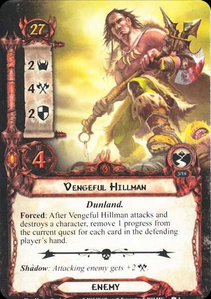 - Vengeful Hillman: This is a much tougher enemy to get engaged with you, but sadly, the lower engagement cost will mean you are going to have to face this foe at some point, perhaps earlier than you’d like. The stats are ok for a Nightmare enemy, with its 4 attack being the most notable stat. You are going to need a decent defender to take care of this enemy, as you cannot chump his attacks. That would trigger the Forced effect of the Hillman. Whenever a character dies due to an attack made by this enemy, you will need to remove 1 progress from the main quest per card in your hand. This will then prolong the quest, and you will have to make more progress in order to clear the stage or beat the game. This is a rather rare effect to trigger, as his 4 attack won’t kill much by itself. There are some shadow effects that will increase his attack, including the shadow on Vengeful Hillman itself. But if you can prioritize this enemy during your defence and chump other attacks instead, you can mostly ignore his textbox. Killing him is also not difficult at all. 2 defence and 4 hitpoints is pretty tame for a Nightmare enemy, but this quest focuses more in overwhelming you with enemies than giving you a few big enemies to fight against. This Hillman is good fodder to distract your defenders with.